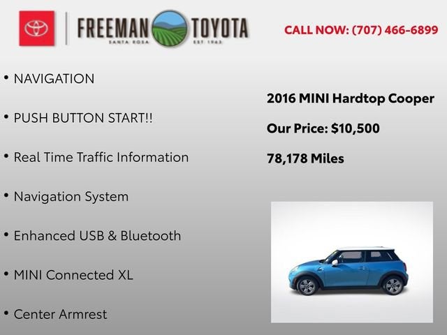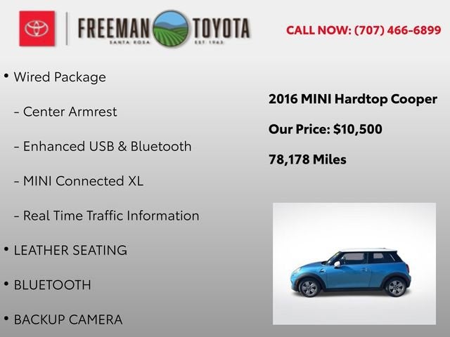 Discover the perfect blend of style and performance with this 2016 MINI Cooper Base. Boasting a stunning Blue exterior and a spacious, well-appointed interior, this MINI is ready to take you on an unforgettable driving experience.• Leather Seating• Bluetooth®• Backup Camera• Navigation• Push Button StartElevate your commute with the Wired Package, which includes a state-of-the-art Navigation System, Real-Time Traffic Information, and Enhanced USB & Bluetooth® connectivity. The MINI Connected XL system puts a wealth of information and entertainment at your fingertips, while the Center Armrest provides added comfort and convenience.Powered by a responsive 1.5L 12V TwinPower Turbo engine and paired with a smooth-shifting 6-Speed Automatic transmission, this MINI Cooper delivers an exhilarating performance with an impressive 27 city / 37 highway MPG rating. The four-wheel independent suspension and speed-sensing steering ensure a nimble and engaging driving experience, while the 4-Wheel Disc Brakes and Electronic Stability Control provide the confidence and control you need on the road.Step inside and experience the premium amenities that set this MINI apart. The SensaTec Leatherette Upholstery offers a luxurious touch, while the Split Folding Rear Seat provides the flexibility to accommodate your cargo needs. Enjoy the convenience of Rear Park Distance Control, the Tilt and Telescoping Steering Wheel, and the Automatic Temperature Control for a personalized driving environment.Exterior features, such as the Heated Door Mirrors, Spoiler, and White Roof & Mirror Caps, add a distinctive flair to the MINI's timeless design. The Alloy Wheels and Rain-Sensing Wipers further enhance the vehicle's style and functionality.With a list price of just $7,500, this 2016 MINI Cooper Base represents an exceptional value in the pre-owned market. Don't miss the opportunity to make this well-equipped and meticulously maintained MINI your own. Schedule a test drive today and experience the joy of driving a MINI Cooper.