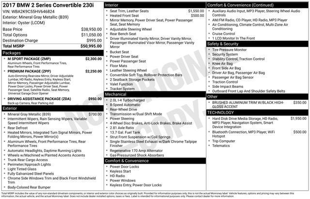 Discover the exhilarating performance and premium features of this 2017 BMW 2 Series 230i. With its powerful 2.0L I4 16V TwinPower Turbo engine, 8-speed automatic transmission, and rear-wheel-drive configuration, this BMW delivers an exceptional driving experience that will leave you craving the open road. Boasting an impressive 23 city/34 highway MPG, this 230i combines efficiency and excitement in equal measure.• Leather Seating• Heated Seats• Bluetooth®• Backup Camera• Navigation• Push Button Start• Wireless Smartphone Charging• M Sport PackageThis 230i also comes equipped with a comprehensive Driving Assistance Package, Premium Package, and the coveted M Sport Package, elevating the driving dynamics and luxury appointments. Enjoy features such as SiriusXM Satellite Radio, Comfort Access Keyless Entry, Lumbar Support, Increased Top Speed Limiter, Rear-View Camera, and more.The exterior of this 230i exudes a sleek, sophisticated style with its Gray paint and Shadowline Exterior Trim. Step inside the cabin and you'll be surrounded by high-quality materials, including Aluminum Hexagon Trim with Estoril Blue Matte Highlight, Ambient Lighting, and a stunning M Sport Steering Wheel.Comfort and convenience are paramount in this BMW, with amenities like Automatic Climate Control, Power Front Seats, and a Universal Garage-Door Opener. The advanced technology features, including the Navigation System, Hi-Fi Sound System, and Wireless Charging, ensure you stay connected and entertained on every journey.With its exceptional performance, premium features, and timeless design, this 2017 BMW 2 Series 230i is a true driver's delight. Experience the thrill of German engineering and the unparalleled craftsmanship of BMW. Visit our showroom today and let us demonstrate how this 230i can elevate your driving experience.