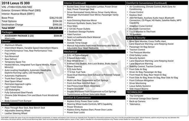 Elevate your driving experience with this exceptional 2018 Lexus IS 300. Blending refined style, advanced technology, and exceptional performance, this sedan is the embodiment of Lexus' commitment to craftsmanship and innovation.Tailored to your needs, this IS 300 boasts an impressive array of premium features, including:- BACKUP CAMERA- BLIND SPOT MONITOR- BLUETOOTH- LEATHER SEATING- POWER MOONROOF- PUSH BUTTON STARTAdditionally, the Accessory Package 2 enhances your ownership experience with thoughtful additions like a Carpet Trunk Mat, Rear Bumper Applique, Key Gloves, Alloy Wheel Locks, and a Cargo Net.Powered by a 2.0L I4 Turbocharged engine and an 8-Speed Automatic with Direct Shift transmission, this rear-wheel-drive Lexus delivers an exceptional blend of efficiency and responsiveness. With an EPA-estimated 22 MPG in the city and 32 MPG on the highway, you can enjoy the thrill of driving without compromising your fuel budget.Beyond its captivating performance, the IS 300 pampers you with a wealth of advanced technology and safety features. Enjoy the convenience of hands-free connectivity, the clarity of a premium audio system, and the confidence of a suite of driver-assistive technologies, including Lexus Enform with Safety Connect.Designed to elevate your everyday commute and weekend adventures, this 2018 Lexus IS 300 is a testament to the brand's commitment to exceptional craftsmanship and uncompromising quality. Experience the difference for yourself and schedule a test drive today.