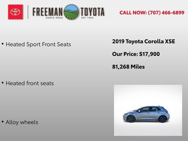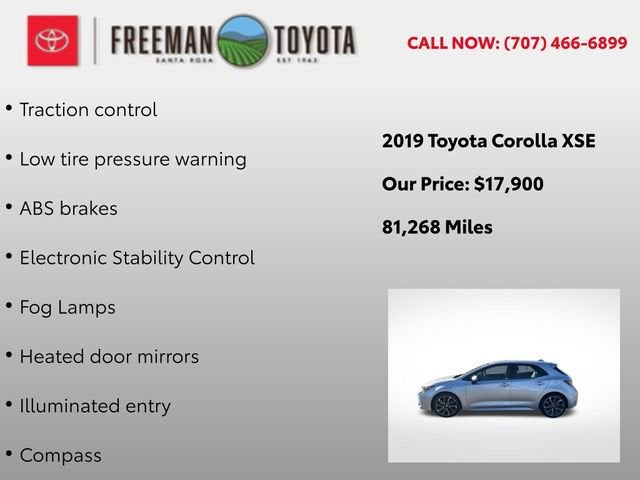 Discover the perfect blend of style, performance, and technology in this exceptional 2019 Toyota Corolla Hatchback XSE. With its sleek silver exterior and meticulously crafted interior, this vehicle is a true standout on the road. Boasting a powerful 2.0L I4 engine and CVT transmission, the Corolla Hatchback delivers a smooth and efficient driving experience, while the front-wheel-drive system ensures confident handling in any conditions.Highlighted features include:• Leather seating• Heated seats• One-owner vehicle• Bluetooth® connectivity• Backup camera• Push-button startThe Corolla Hatchback also offers a host of premium amenities to elevate your driving experience, such as:• Dual-zone automatic climate control• Remote keyless entry• Traction control• ABS brakes• Low tire pressure warning• Electronic stability control• Fog lamps• Heated door mirrors• Compass• Illuminated entry• Alloy wheelsWith its exceptional fuel efficiency, advanced safety features, and sleek, modern design, this 2019 Toyota Corolla Hatchback XSE is the perfect choice for the discerning driver. Experience the difference for yourself and schedule a test drive today. We're confident you'll be impressed by the quality, performance, and value this vehicle has to offer.The Corolla Hatchback's impressive list of standard features includes 6 speakers, SiriusXM radio, air conditioning, power windows and locks, steering wheel-mounted audio controls, and a rear window defroster, ensuring your daily commute or weekend adventures are both comfortable and convenient. The four-wheel independent suspension and speed-sensing steering provide a smooth and responsive ride, while the dual front impact and side airbags, as well as the emergency communication system, offer the peace of mind you deserve.Elevate your driving experience with the Corolla Hatchback's premium amenities, such as the leather-wrapped shift knob, auto high-beam headlights, and the Entune 3.0 audio system with an upgraded head unit. The blind spot monitoring, rear parking camera, and variable intermittent wipers further enhance your confidence and control on the road.With its exceptional value, impressive features, and undeniable style, this 2019 Toyota Corolla Hatchback XSE is an exceptional choice for the modern driver. Visit our showroom today to experience this remarkable vehicle firsthand and discover why it should be your next automotive investment.