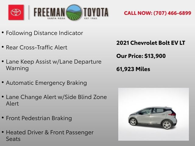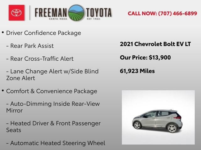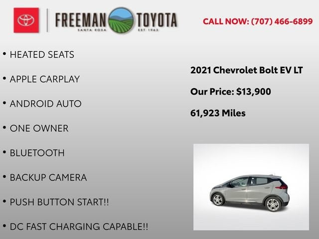 Discover the exceptional 2021 Chevrolet Bolt EV LT, a cutting-edge electric vehicle that combines style, performance, and unparalleled efficiency. With its striking Gray exterior and a host of advanced features, this Bolt EV is poised to redefine your driving experience.- Heated Seats- Apple CarPlay- Android Auto- One Owner- Bluetooth- Backup Camera- Push Button Start- DC Fast Charging Capable- Charger Included- Automatic Heated Steering Wheel- Rear Park Assist- DC Fast Charging- Forward Collision Alert- IntelliBeam Automatic On/Off High Beam- 3-Spoke Leather-Wrapped Steering Wheel- Auto-Dimming Inside Rear-View Mirror- Automatic Emergency Braking- Following Distance Indicator- Front Pedestrian Braking- Lane Change Alert w/Side Blind Zone Alert- Lane Keep Assist w/Lane Departure Warning- Rear Cross-Traffic Alert- Heated Driver & Front Passenger SeatsThis Bolt EV LT is equipped with the Comfort & Convenience Package, the Driver Confidence II Package, and the Driver Confidence Package, offering an unmatched level of comfort, safety, and convenience. With an impressive MPGe of 127 in the city and 108 on the highway, this electric marvel delivers exceptional efficiency, minimizing your environmental impact and reducing your fuel costs.Slip behind the wheel of the 2021 Chevrolet Bolt EV LT and experience the future of driving. Packed with cutting-edge technology, advanced safety features, and a stylish, modern design, this electric vehicle is the perfect blend of performance, efficiency, and sophistication. Contact us today to schedule a test drive and discover the exceptional driving experience that awaits you.