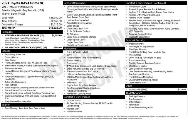 Discover the epitome of modern SUV engineering with this exceptional 2021 Toyota RAV4 Prime SE. Boasting a captivating blend of style, performance, and cutting-edge technology, this all-wheel-drive marvel is poised to elevate your driving experience to new heights.Meticulously equipped, this RAV4 Prime SE offers an impressive array of premium features, including:- All-Wheel Drive- Android Auto and Apple CarPlay- Backup Camera- Blind Spot Monitor- Bluetooth- Heated Seats- One-Owner Vehicle- Power Liftgate- Power Moonroof- Push-Button Start- Weather & Moonroof PackageElevating your comfort and convenience, the Weather & Moonroof Package includes a heated leather steering wheel, rain-sensing wipers with a de-icer function, and heated rear seats perfect for those chilly mornings. The tilt-and-slide moonroof allows you to bask in the natural light, creating an open and airy cabin ambiance.Powered by a potent 2.5L 4-cylinder DOHC engine with a continuously variable transmission, this RAV4 Prime SE delivers a thrilling and efficient driving experience. With its advanced all-wheel-drive system, you'll conquer any road with confidence, whether navigating through inclement weather or tackling challenging terrain.Safety is paramount, and this RAV4 Prime SE is equipped with a comprehensive suite of advanced driver-assistance technologies, including Blind Spot Monitoring, Rear Cross-Traffic Alert, and a Rear-View Camera. These features work in harmony to provide you with heightened awareness and peace of mind behind the wheel.Immerse yourself in the refined and modern interior, where premium materials and thoughtful design elements create an inviting and sophisticated atmosphere. The spacious cabin offers ample room for your passengers and cargo, ensuring your journeys are as comfortable as they are rewarding.This exceptional 2021 Toyota RAV4 Prime SE is a testament to the brand's commitment to excellence. With its captivating style, impressive performance, and wealth of advanced features, it's the perfect choice for the discerning SUV enthusiast. Experience the future of driving today schedule a test drive and discover the exceptional capabilities of this remarkable vehicle.