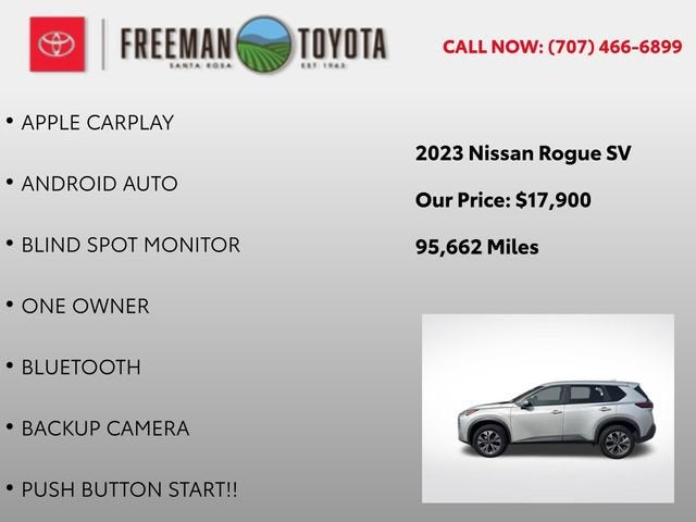 Discover the 2023 Nissan Rogue SV – a versatile and sophisticated crossover that seamlessly blends style, technology, and performance. This well-equipped model offers an exceptional driving experience, with a turbocharged engine that delivers impressive power and efficiency.- ANDROID AUTO- APPLE CARPLAY- BACKUP CAMERA- BLIND SPOT MONITOR- BLUETOOTH- ONE OWNER- PUSH BUTTON STARTSlip into the comfortable and well-appointed interior, where you'll find a wealth of desirable features, including automatic climate control, a power driver's seat, and a premium audio system with SiriusXM radio. The Rogue SV also boasts advanced safety technologies, such as Nissan's Intelligent Mobility suite, which includes features like Automatic Emergency Braking and Intelligent Forward Collision Warning, keeping you and your loved ones secure on the road.Designed to adapt to your lifestyle, the 2023 Nissan Rogue SV offers a spacious and versatile cabin, with ample room for passengers and cargo. The split-folding rear seats and generous storage space make it easy to accommodate your ever-changing needs, whether you're embarking on a road trip or tackling your daily commute.Combining a sleek, modern exterior with a refined and well-equipped interior, the Rogue SV is a standout in its class. With an impressive fuel economy rating of 30 mpg in the city and 37 mpg on the highway, this crossover delivers exceptional efficiency without sacrificing performance.Experience the perfect balance of style, technology, and capability in the 2023 Nissan Rogue SV. This one-owner vehicle is a true gem, and we're confident it will exceed your expectations. Schedule a test drive today and discover the joy of driving this exceptional crossover.