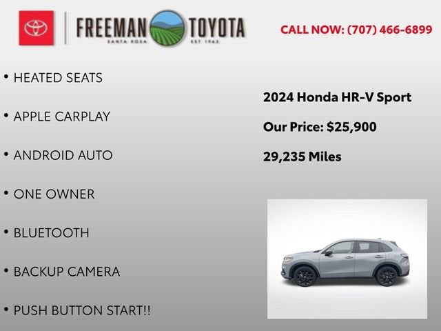 Discover the perfect blend of style, technology, and performance with the 2024 Honda HR-V Sport. This exceptional compact SUV is designed to elevate your driving experience, offering a captivating combination of features that cater to your every need.Indulge in the convenience of - HEATED SEATS, APPLE CARPLAY, ANDROID AUTO, ONE OWNER, Bluetooth®, and BACKUP CAMERA, all of which come standard with this meticulously maintained HR-V. The push-button start feature adds a touch of modern sophistication, ensuring a seamless start to your journey.Beneath the sleek exterior, the HR-V Sport is powered by a 2.0L I4 DOHC 16V i-VTEC engine, delivering a smooth and efficient performance with its CVT transmission and front-wheel drive. With an impressive fuel economy of 26 MPG in the city and 32 MPG on the highway, this SUV strikes the perfect balance between power and efficiency.Elevate your driving experience with the HR-V's array of advanced safety features, including Adaptive Cruise Control, Automatic High-Beam Headlights, and a Rear-View Camera. These cutting-edge technologies work in harmony to keep you and your loved ones secure on the road.Indulge in the comfort and style of the HR-V's Cloth Seat Trim, Leather Steering Wheel, and Heated Front Bucket Seats. The spacious interior, with its split-folding rear seat, offers ample room for all your cargo and passengers, ensuring a truly versatile and accommodating ride.The exterior of the HR-V Sport exudes a bold and dynamic presence, thanks to its Gloss Black Alloy Wheels and sporty Spoiler. This compact SUV seamlessly blends form and function, making it a head-turner on the road.With its impressive list of features, exceptional fuel efficiency, and sleek design, the 2024 Honda HR-V Sport is the perfect companion for your adventures. Experience the thrill of driving this remarkable SUV for yourself. Visit our showroom today and let us help you discover the perfect vehicle to fit your lifestyle.