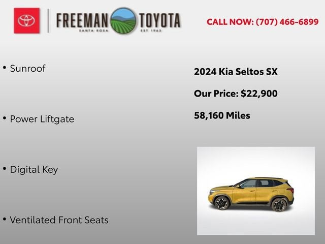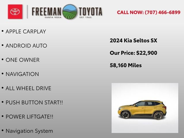 Elevate your driving experience with this exceptional 2024 Kia Seltos SX. This stunning SUV, dressed in a vibrant Green exterior, is a true head-turner that combines style, performance, and cutting-edge technology.Packed with an impressive array of premium features, this Seltos SX stands out from the crowd. Indulge in the luxurious comfort of Leather Seating, while the Power Moonroof and Heated and Cooled Seats add an extra layer of refinement. Seamlessly connect your devices with Apple CarPlay and Android Auto, and let the Navigation system guide you with ease. The One Owner history and All Wheel Drive capability ensure both reliability and confident handling, while the Power Liftgate and Push Button Start add exceptional convenience.• Leather Seating• Power Moonroof• Heated and Cooled Seats• Apple CarPlay• Android Auto• One Owner• Navigation• All Wheel Drive• Power Liftgate• Push Button StartThe SX Sunroof Package further enhances your driving experience, offering Digital Key, a Power Liftgate, and Ventilated Front Seats. With a fuel-efficient I4 engine and an 8-Speed Automatic transmission, this Seltos SX delivers an impressive 25 city / 27 highway MPG, making it a practical and economical choice.Discover the perfect balance of style, technology, and performance in this 2024 Kia Seltos SX. Elevate your daily commute and weekend adventures with this exceptional SUV. Contact us today to schedule a test drive and experience the difference for yourself.This Seltos SX is available now at our showroom, and we're confident it won't last long. Don't miss your opportunity to make this stunning SUV your own. Our dedicated team is here to assist you every step of the way, ensuring a seamless and enjoyable purchasing process. We look forward to welcoming you and helping you find the perfect vehicle to fit your lifestyle.
