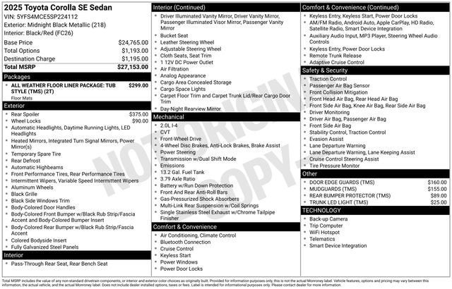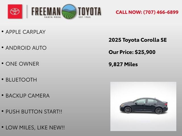 Discover the exceptional 2025 Toyota Corolla SE, a vehicle that seamlessly blends style, performance, and unparalleled value. With its sleek black exterior and meticulously crafted interior, this Corolla SE is more than just a reliable daily driver it's a true expression of sophistication and modern design.- APPLE CARPLAY- ANDROID AUTO- ONE OWNER- BLUETOOTH- BACKUP CAMERA- PUSH BUTTON START!!- LOW MILES, LIKE NEW!!- REAR SPOILER (TMS)- ALL WEATHER FLOOR LINER PACKAGE: TUB STYLE (TMS)- DOOR EDGE GUARDS (TMS)- MUDGUARDS (TMS)- ALLOY WHEEL LOCKS (TMS)- REAR BUMPER PROTECTOR (TMS)- TRUNK LED LIGHT (TMS)Powered by a robust 2.0L I4 DOHC 16V engine and equipped with a seamless CVT transmission, this Corolla SE delivers an exceptional driving experience. With an impressive 31 MPG in the city and 40 MPG on the highway, you'll enjoy the perfect balance of power and efficiency, making every commute a pleasure.Step inside and be captivated by the thoughtful attention to detail. The Corolla SE's spacious cabin is outfitted with premium features, including a state-of-the-art 8 Toyota Audio Multimedia system, a rear-view camera, and a suite of advanced safety technologies. Enjoy the convenience of hands-free connectivity with Apple CarPlay and Android Auto, ensuring you stay connected and entertained on the go.This one-owner Corolla SE boasts a mere 9,827 miles, making it a true gem in the pre-owned market. With its pristine condition and low mileage, it's the perfect choice for discerning buyers who demand quality and value. Discover the unparalleled driving experience and exceptional ownership benefits that the 2025 Toyota Corolla SE has to offer.We invite you to visit our showroom and experience the Corolla SE for yourself. Our knowledgeable sales team is standing by to answer any questions you may have and guide you through the purchasing process. Let us help you find the perfect vehicle to suit your lifestyle and budget. Visit us today and drive away in the 2025 Toyota Corolla SE a true testament to Toyota's commitment to excellence.